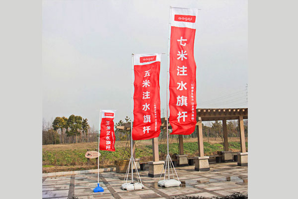 注水旗/水柱道旗制作 注水旗顧名思義就是可以注水的。通常有3米、5米、7米三種不同高度的旗桿。三米注水旗桿旗面尺寸為06*1.6m,五米注水旗桿旗面尺寸為1-2m*3.5m,七米注水旗桿旗面尺寸為1-2m*5.5m。